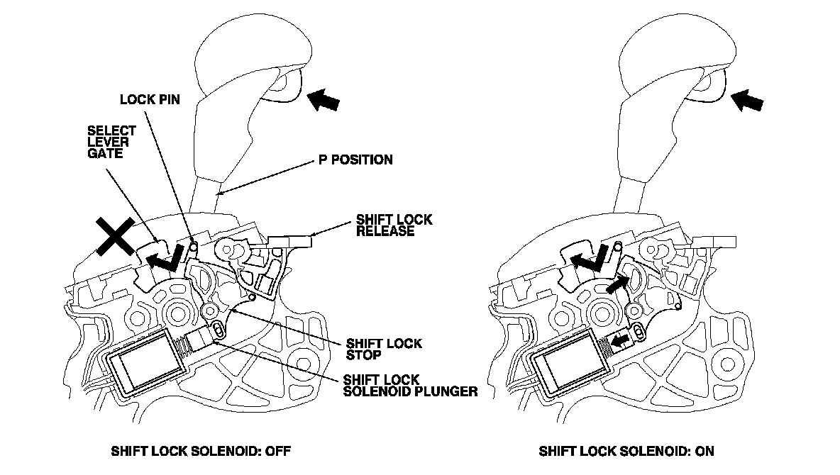 The shift lock system prevents the shift lever from mis-shifting. The shift lock solenoid is usually OFF. After starting the engine in P, the shift lever cannot move to any other position from P because the shift lock stop stops the lock pin unless the brake pedal is pressed. When the brake pedal is pressed and the accelerator pedal is not pressed, the shift lock solenoid is ON; the shift lock solenoid plunger in the shift lock solenoid pulls the shift lock stop to release the lock pin. Pressing the shift lever button allows the shift lever to move to any other position. When the brake pedal and the accelerator pedal are pressed at the same time, the shift lock system is not unlocked.