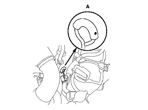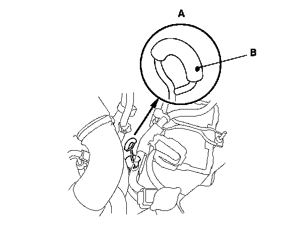 9. Insert the dipstick (A) back into the tube with the dot (B) on the handle facing to the left side of the vehicle.