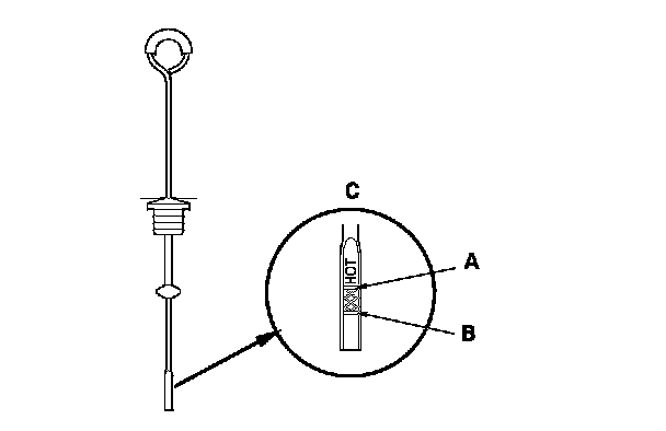 5. Remove the dipstick, and check the CVT fluid level. It should be between the upper mark (A) and the lower mark (B) on the HOT level (C).
