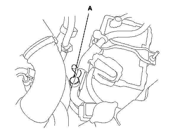 8. If necessary, fill the transmission with CVTF through the dipstick tube opening (A) to bring the fluid level between the upper mark and the lower mark of the dipstick. Do not fill the fluid above the upper mark. Always use Honda CVT fluid (CVTF). Using a non-Honda CVTF can affect shift quality.