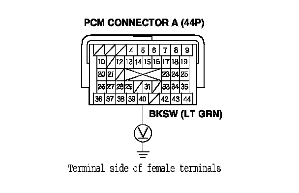 20. Measure the voltage between PCM connector terminal A40 and body ground while pressing the brake pedal and when the brake pedal is released.