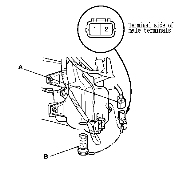 2. Disconnect the 2P connector (A) from the washer fluid level switch (B).