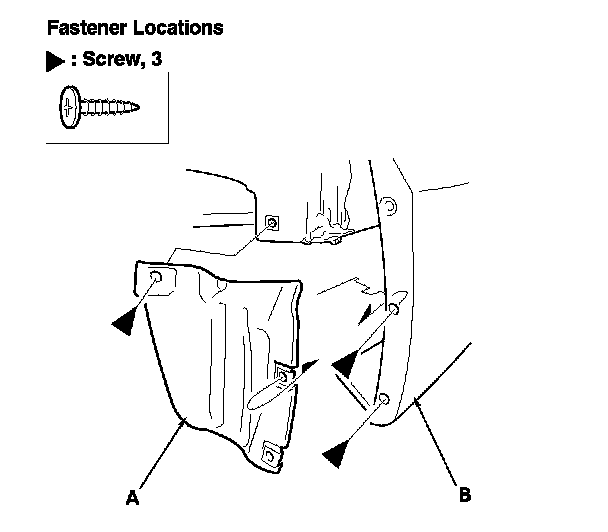 1. Remove the screws, then remove the rear fender cover (A) from the rear bumper (B) and the body.
