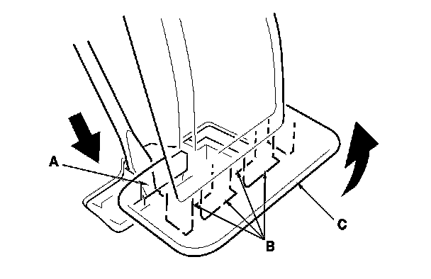 2. '06-08 models: Push the knob (A) back to release the hooks (B), then pull up the accelerator pedal (C).