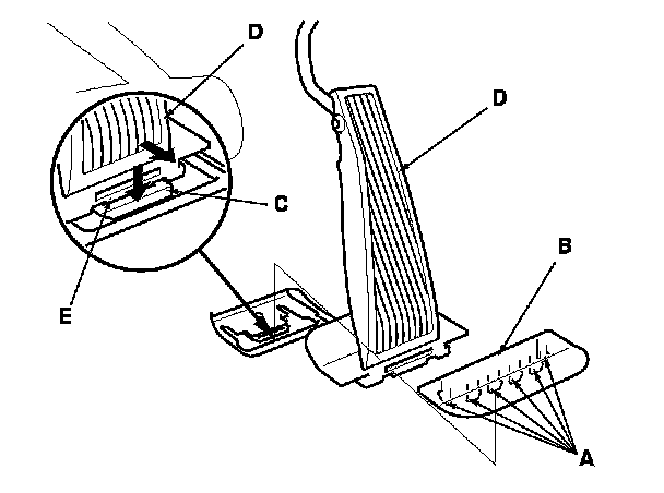 3. '09 model: Release the hooks (A) to remove the accelerator pedal clip (B). While pushing down the back-up spring (C), pull back the accelerator pedal (D) to release the hook (E).