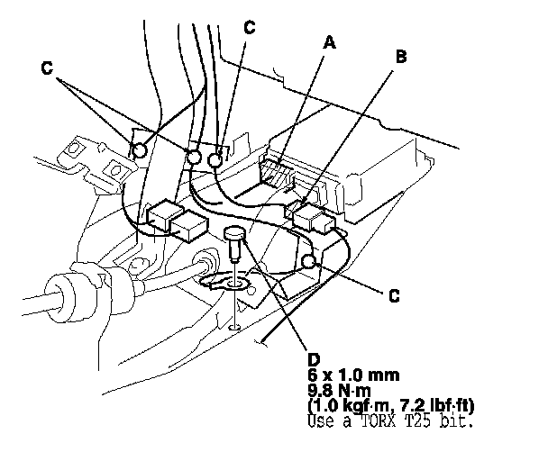 5. Disconnect the SRS unit connector A and the antenna connector (B), and detach the wire harness clips (C). Remove the ground bolt (D) using a TORX T30 bit.