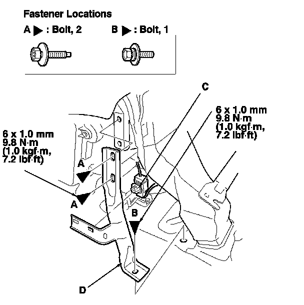 6. Remove the bolts (A, B), and detach the connector clip (C), then remove the center pipe extension (D).