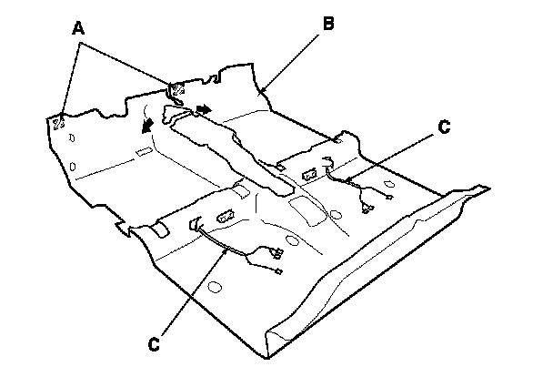 12. Pull the seat harnesses (C) out through the hole in the carpet, then remove the carpet.