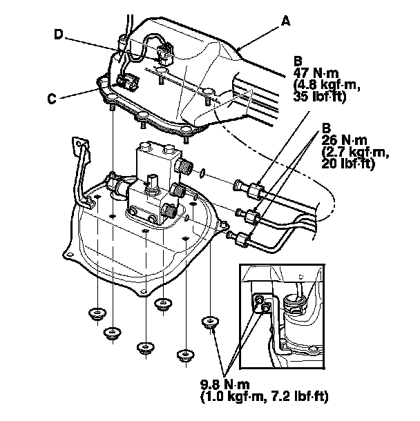 6. Remove the FTT sensor (B), the FTP sensor (C), and the bolts (D).