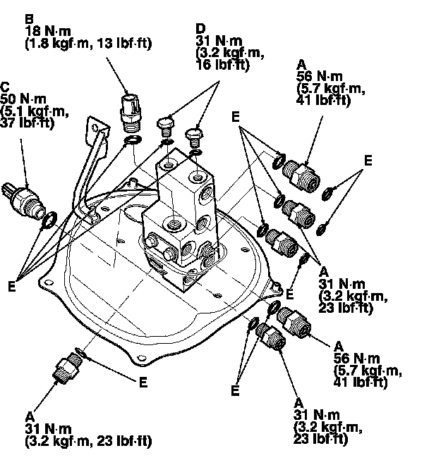 7. Apply silicone oil or poly alkylene glycol (PAG) oil to the new O-rings (E), and carefully install them into their proper positions. Service and Repair