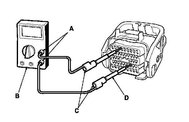 6. Connect one side of the patch cord's terminals (A) to a commercially available digital multimeter (B), and connect the other side cord's terminals (C) to a commercially available banana jack (Pomona Electronics Tool No. 3563 or equivalent) (D).