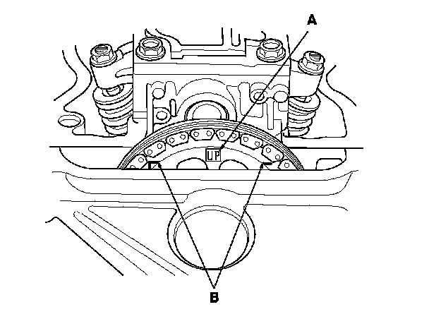 2. Set the No. 1 piston at top dead center (TDC). The "UP" mark (A) on the camshaft sprocket should be at the top, and the TDC grooves (B) on the camshaft sprocket should line up with the top edge of the head.