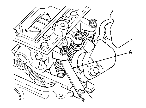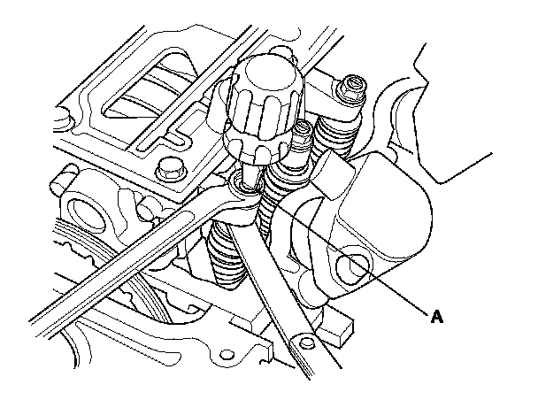 4. Insert the feeler gauge (A) between the adjusting screw and the end of the valve stem on No. 1 cylinder, and slide it back and forth; you should feel a slight amount of drag.