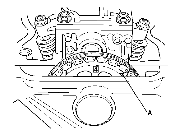 9. Rotate the crankshaft clockwise. Align the No. 4 piston TDC groove (A) on the camshaft sprocket with the top edge of the head.