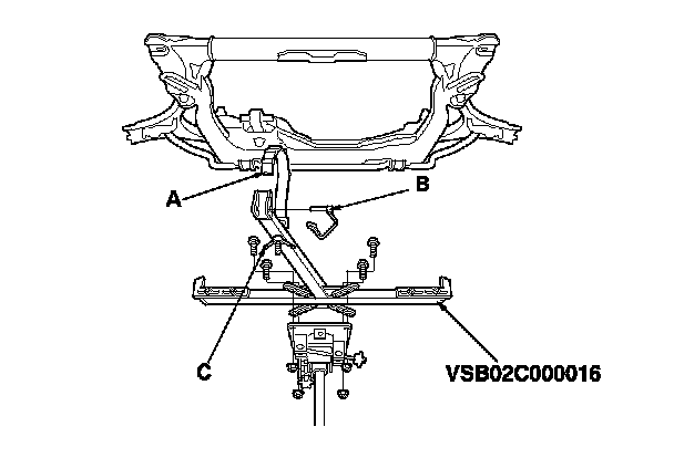 19. Set the front subframe adapter (VSB02C000016) to the front subframe by looping the strap (A) over the front of the front subframe, then secure the strap with the stop (B), then tighten the wing nut (C).