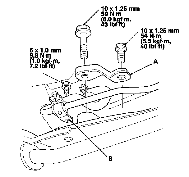 47. Loosen the transmission mounting bolt (A) and the nuts (B).