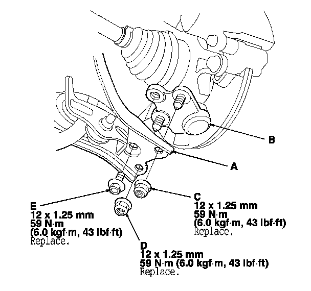 34. Tighten the nuts and the bolts to 59 N-m (6.0 kgf-m, 43 lbf-ft) in the following order; (C), (D), then (E).