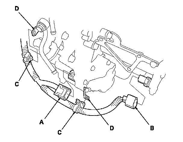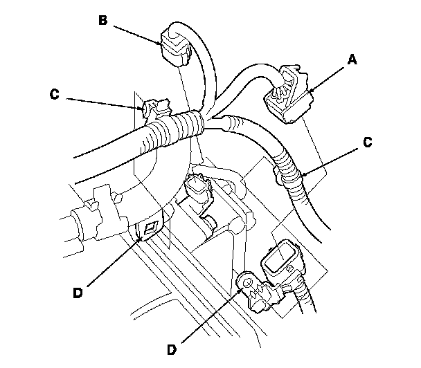 37. Connect the shift solenoid wire harness connector (A) and the 3rd clutch transmission fluid pressure switch connector (B), and install the harness clamps (C) on the clamp brackets (D).