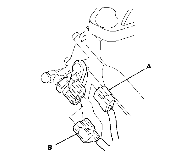41. Connect the input shaft (mainshaft) speed sensor connector (A) and the 2nd clutch transmission fluid pressure switch connector (B).