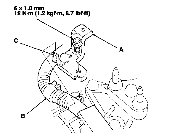 31. Secure the power steering fluid line bracket (A) with the bolt, and secure the line (B) with the clamp (C).