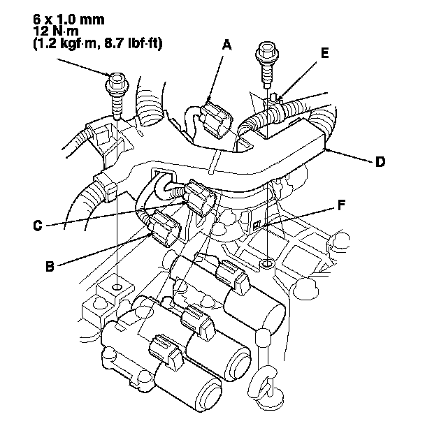 45. Secure the harness cover (D) with the mounting bolts, and install the harness clamp (E) on its bracket (F).