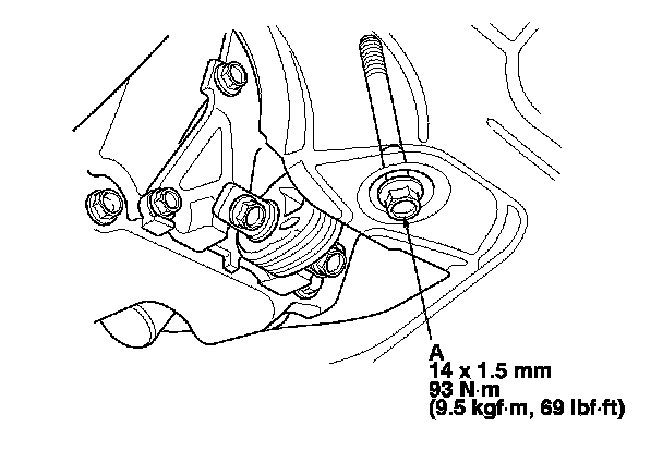 12. Attach the torque converter to the drive plate with the eight bolts (A). Rotate the crankshaft pulley as necessary to tighten the bolts to 1/2 of the specified torque, then to the final torque, in a crisscross pattern. After tightening the last bolt, check that the crankshaft rotate freely.