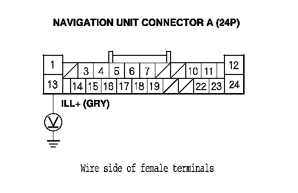 10. With the headlight switch still on, measure the voltage between navigation unit connector A (24P) terminal No. 13 and body ground.