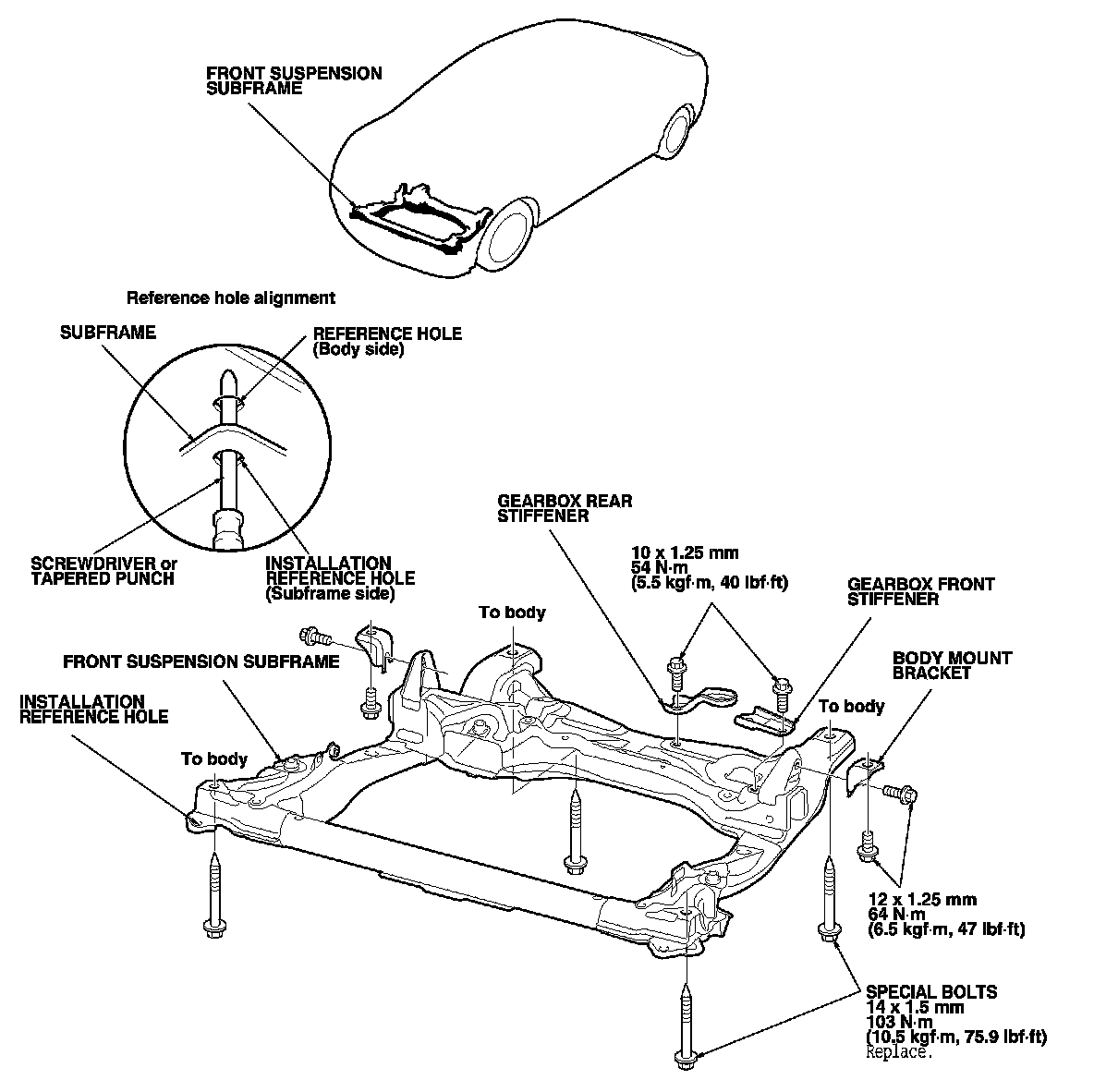 - When installing, align both installation reference holes in the subframe with both reference holes in the body using a screwdriver or tapered punch as a guide.
