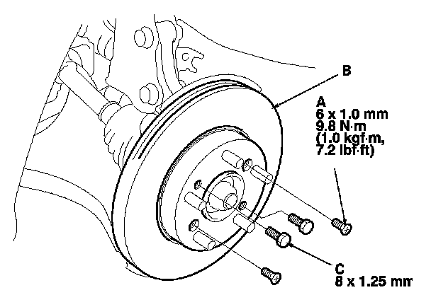NOTE: If the brake disc is stuck to the front hub, thread two 8 x 1.25 mm bolts (C) into the brake disc to push it away from the front hub. Turn each bolt 90 degrees at a time to prevent the brake disc from binding.