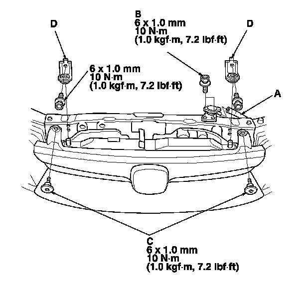 5. Disconnect the reservoir hose (A) and remove the radiator cap base mounting bolts (B), the bolts (C), and the radiator upper brackets (D).
