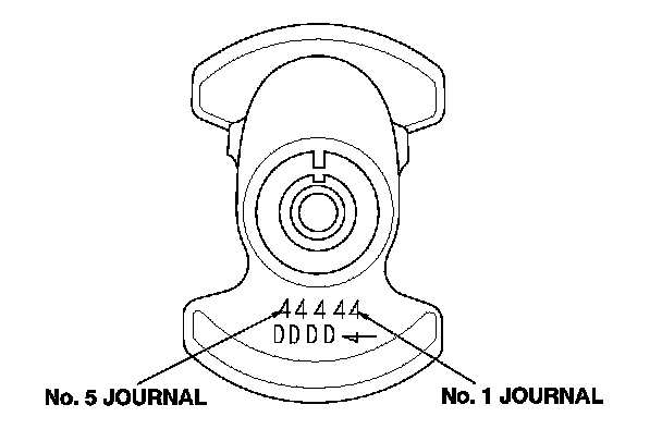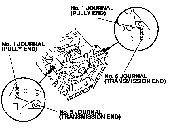 1. Numbers, letters, or bars have been stamped on either side of the engine block end as a code for the size of each of the five main journal bores. Write down the crank bore codes.