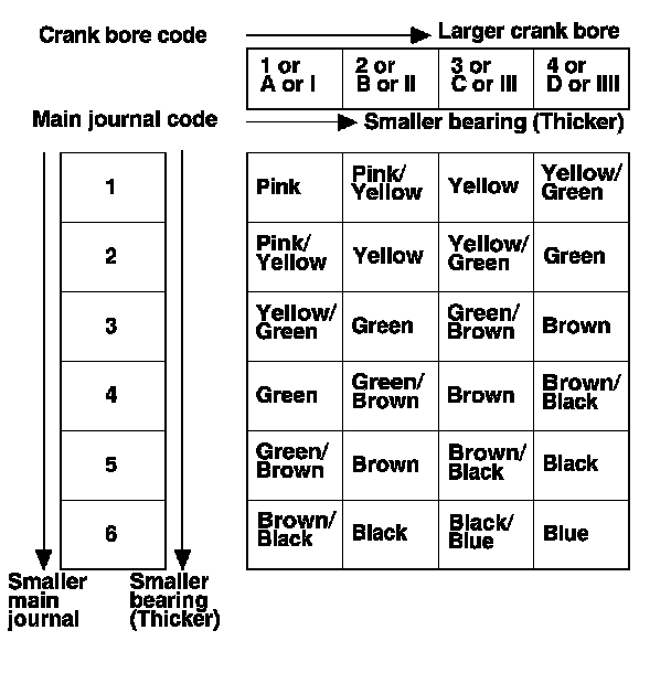 3. Use the crank bore codes and crank journal codes to select the appropriate replacement bearings from the following table.