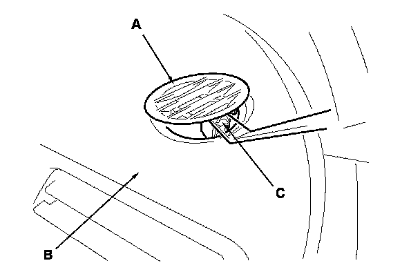 1. Insert the appropriate trim tool into a gap between the side defogger vent trim (A) and the dashboard (B), and release the hook (C).