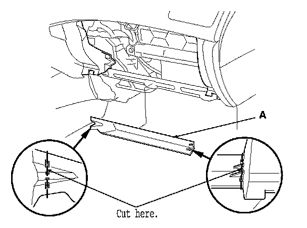 2. Cut the plastic cross brace (A) in the glove box opening with diagonal cutters in the area shown, and discard it.