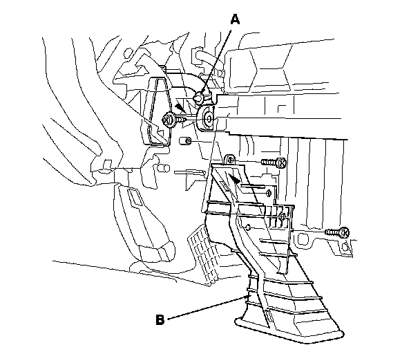 4. Remove the wire harness clip (A), the self-tapping screws, and the passenger's heater duct (B).