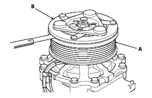 3. Measure the clearance between the rotor pulley (A) and the armature plate (B) all the way around. If the clearance is not within specified limits, remove the armature plate Service and Repair and add or remove shims as needed to increase or decrease clearance.