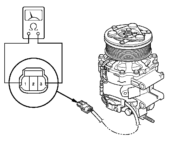 4. Check for continuity between the A/C compressor clutch connector terminals No. 1 and No. 3. If there is no continuity, replace the thermal protector. A/C Compressor Thermal Protector Replacement (With A/C)