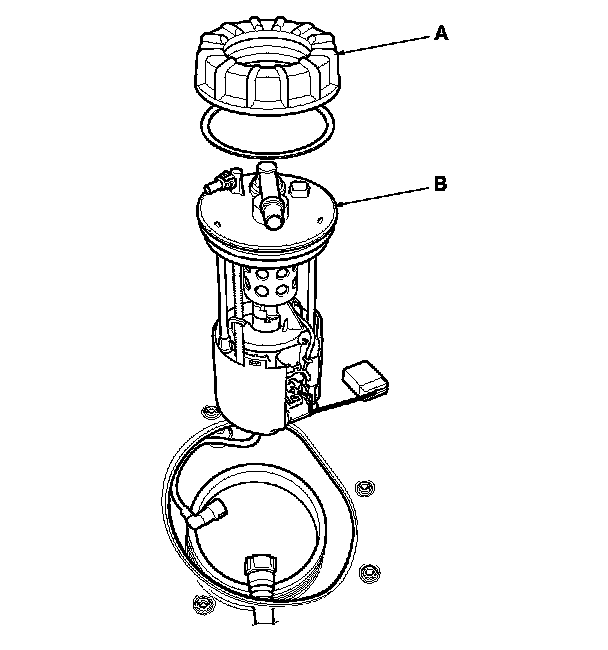 8. Remove the locknut (A) and the fuel tank unit (B).
