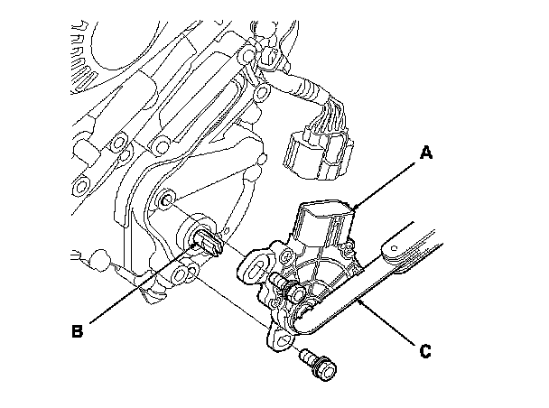 7. Install the transmission range switch (A) gently on the selector control shaft (B) while holding it in the N position with the 2.0 mm (0.08 in.) blade (C).