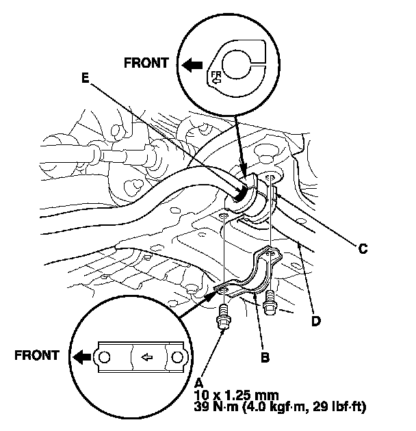 NOTE: During installation align the paint marks (E) on the stabilizer bar with the sides of the bushings.
