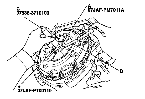 2. Check the evenness of the height of the diaphragm spring fingers using the clutch alignment disc (A), the clutch alignment shaft (B), the remover handle (C), and a feeler gauge (D). If the height difference is more than the service limit, replace the pressure plate.
