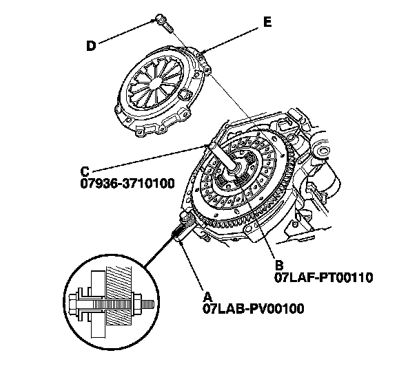 4. To prevent warping, loosen the pressure plate mounting bolts (D) in a crisscross pattern in several steps, then remove the pressure plate (E).
