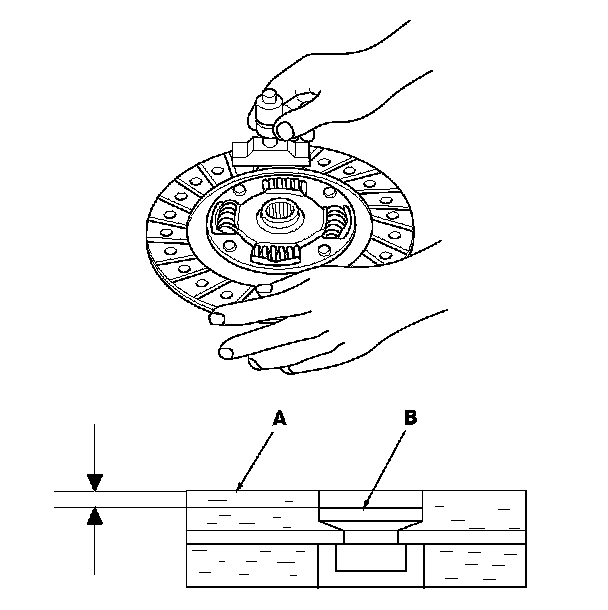 11. Measure the rivet depths from the clutch disc lining surface (A) to the rivets (B) on both sides. If the measurement is less than the service limit, replace the clutch disc.