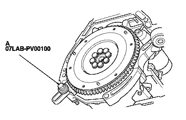 19. Install the ring gear holder (A), then tighten the flywheel mounting bolts (B) in a crisscross pattern in several steps.