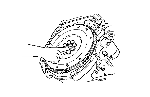 17. Loosen the flywheel mounting bolts in a crisscross pattern in several steps. Remove the bolts, then remove the flywheel and the ring gear holder.