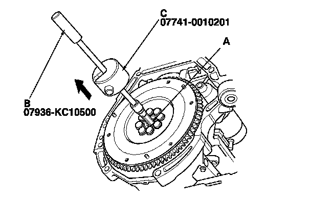 8. Remove the clutch disc (A), the clutch alignment shaft (B), and the remover handle (C).