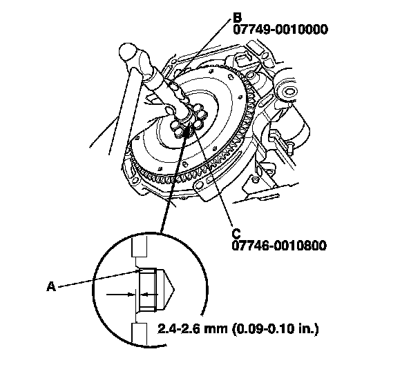 7. Inspect for warpage using a straight edge (A) and a feeler gauge (B). Measure across the pressure plate surface (C). If the most measurement difference is more than the service limit, replace the pressure plate.
