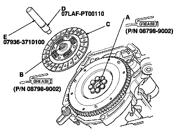 26. Apply super high temp urea grease (P/N 08798-9002) to the splines (B) of the clutch disc (C), then install the clutch disc using the clutch alignment shaft (D) and the remover handle (E).