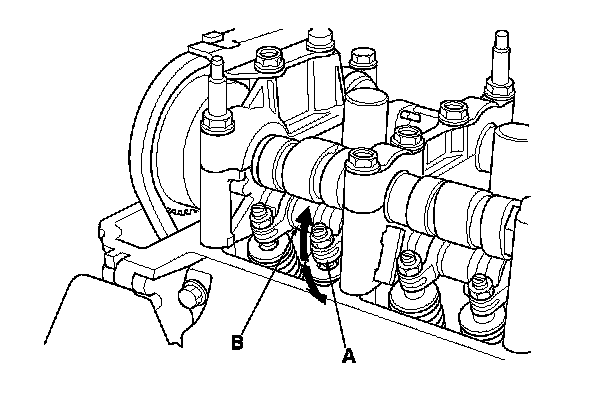 4. Move the secondary rocker arm (A) for No. 1 cylinder. The secondary rocker arm should move independently of the mid rocker arm (B).