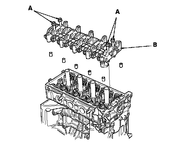 4. Insert the bolts (A) into the rocker shaft holder, then install the rocker arm assembly (B) on the cylinder head.